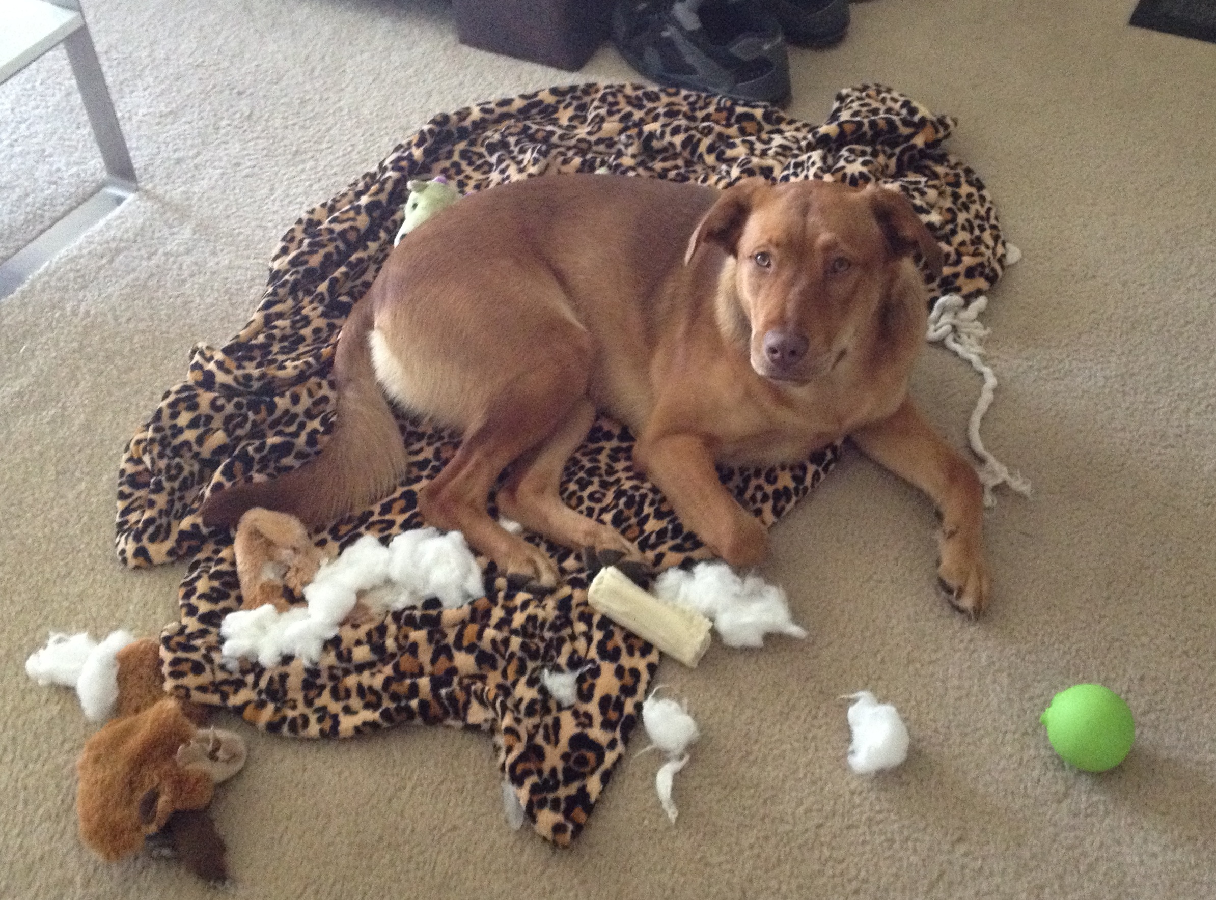Hooray for dog love! (And cat love, and all animal love!) Oh, those clouds of white stuffing . . . what a familiar sight. My two mutts have a pile of gutted “bears,” and Luna, the little girl mutt, actually arranged them the other evening so they made a perfect circle around her.