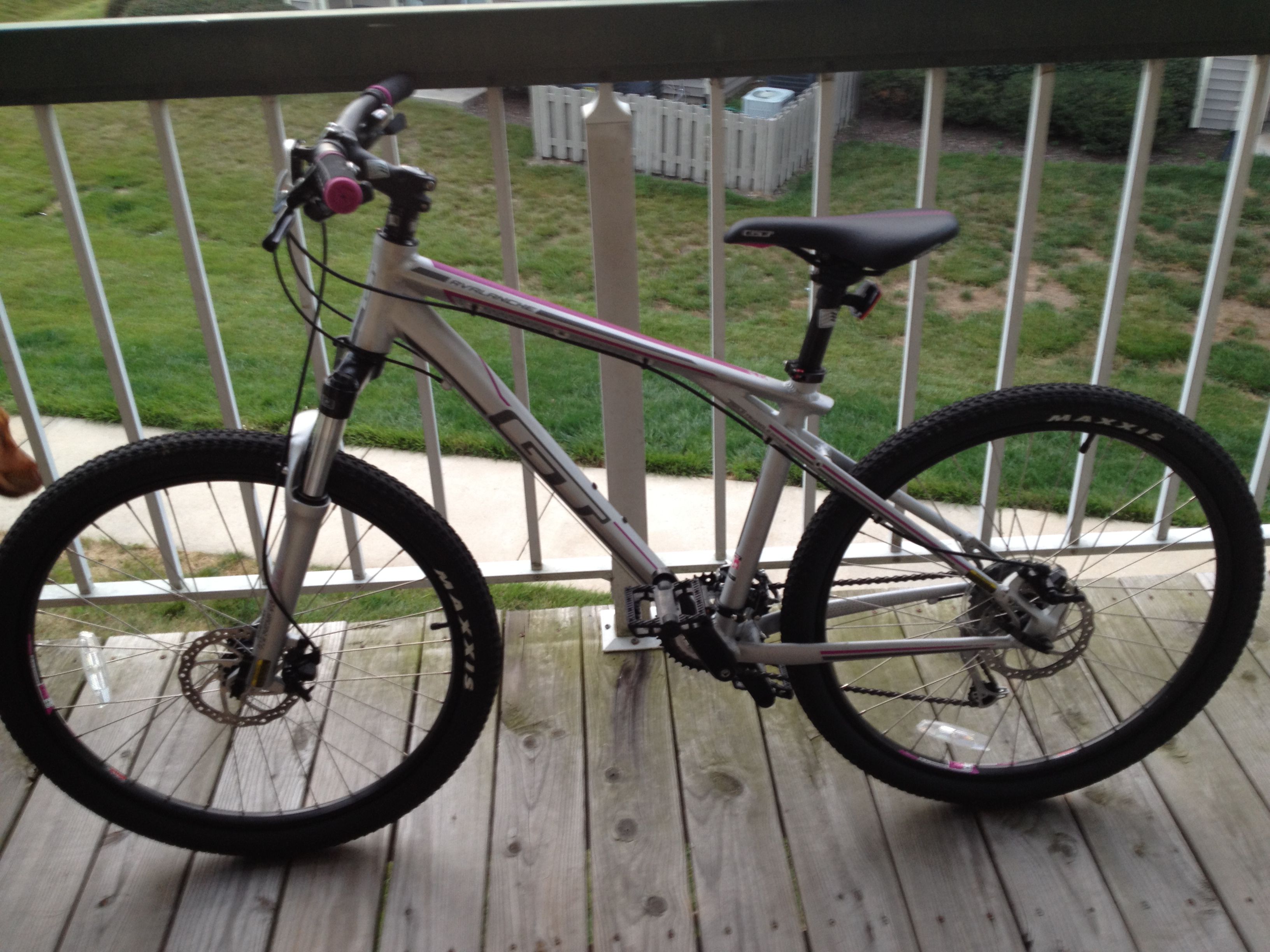 This is my lovely torture device! I promised I’d buy a bike this summer and since I made said promise over a year ago I figured it’d been forgotten by all, me included. Sadly not so and off to the bike shop we went. I ended up with this beauty. I wanted the red/silver one that looked more sleek and less “pink.” However that wasn’t to be. Instead I got this one that I do kind of like. I’m not in love with it yet, despite how often I’m told what a good bike I have, but I’m enjoying it.